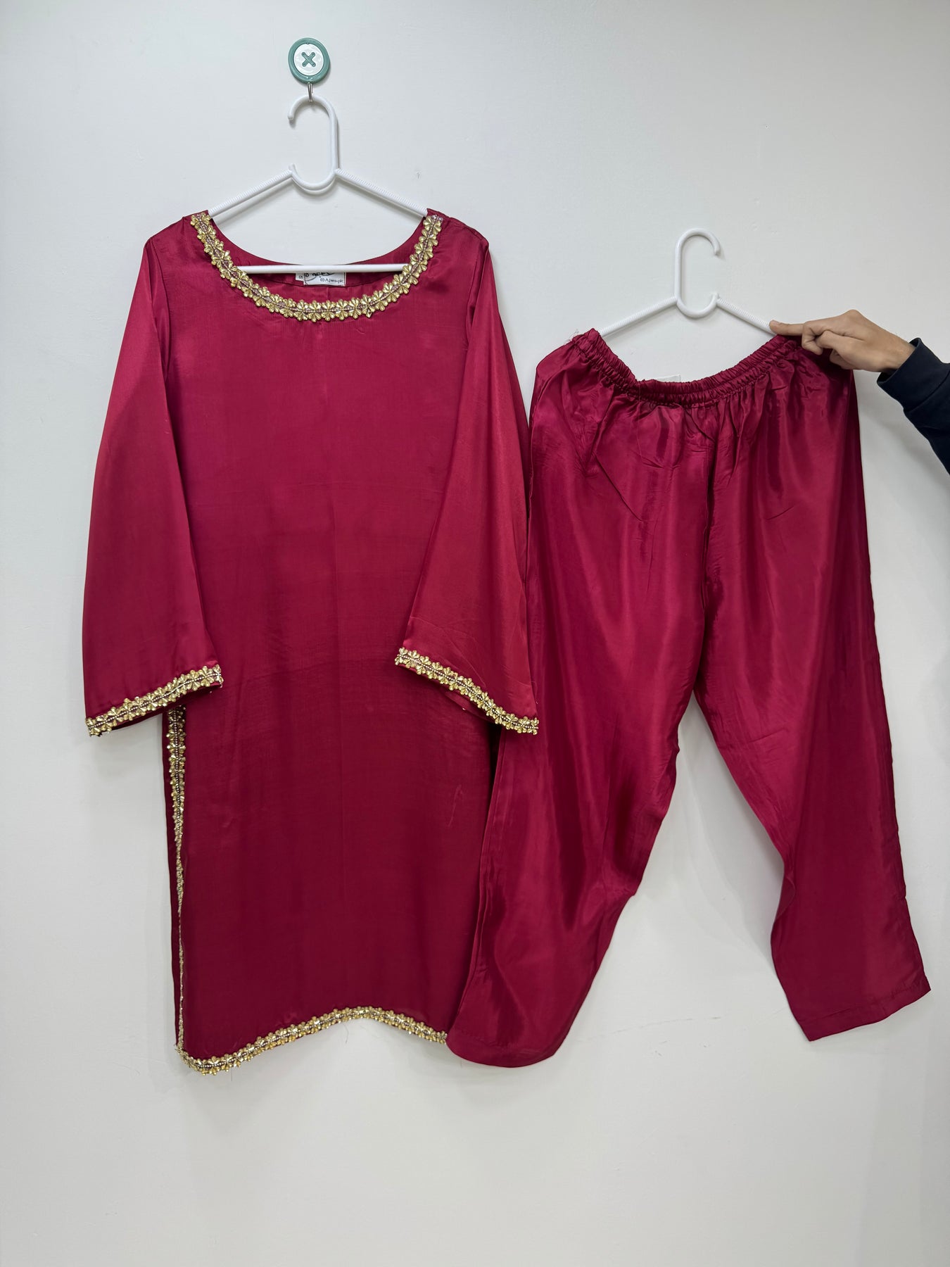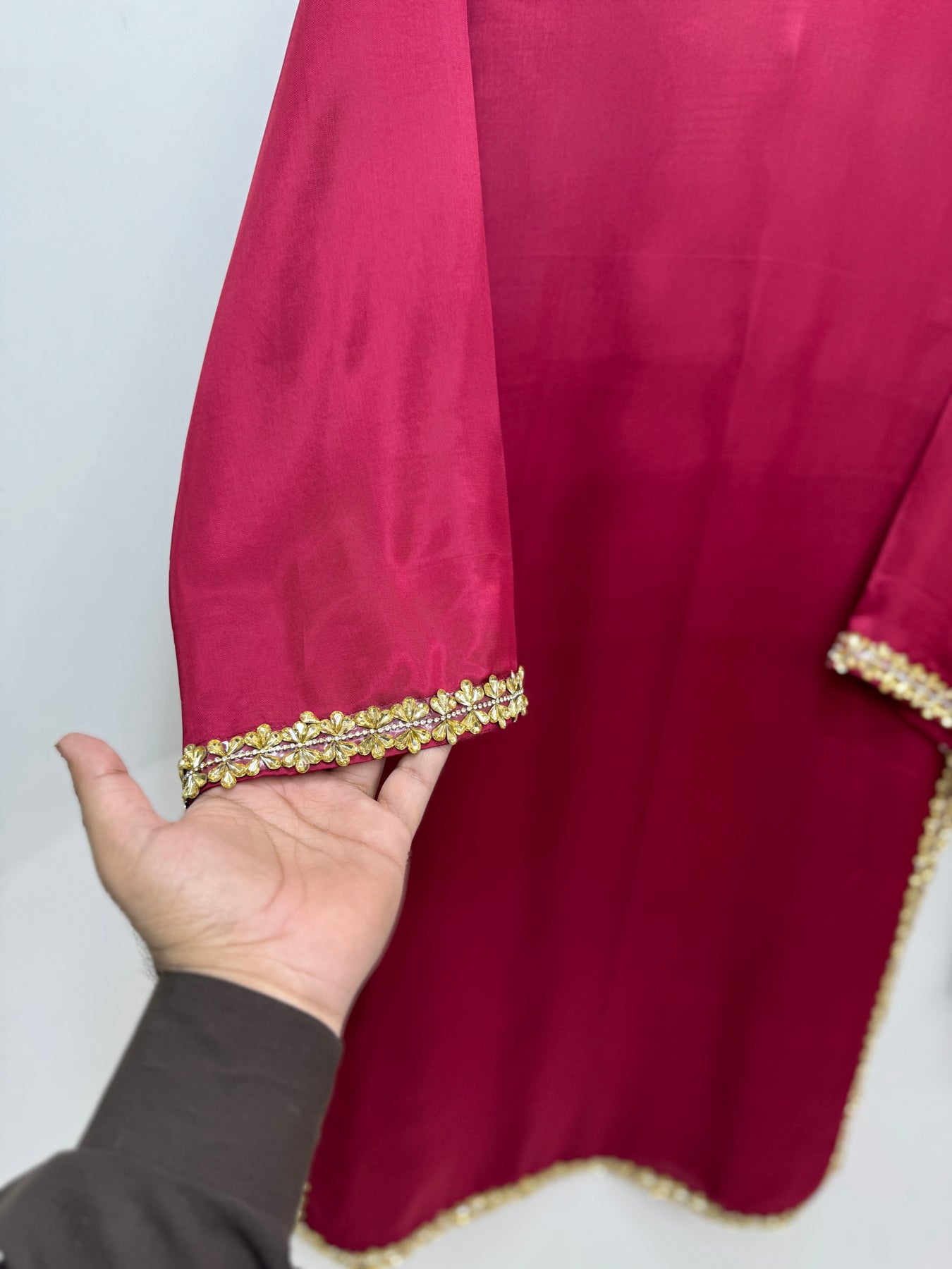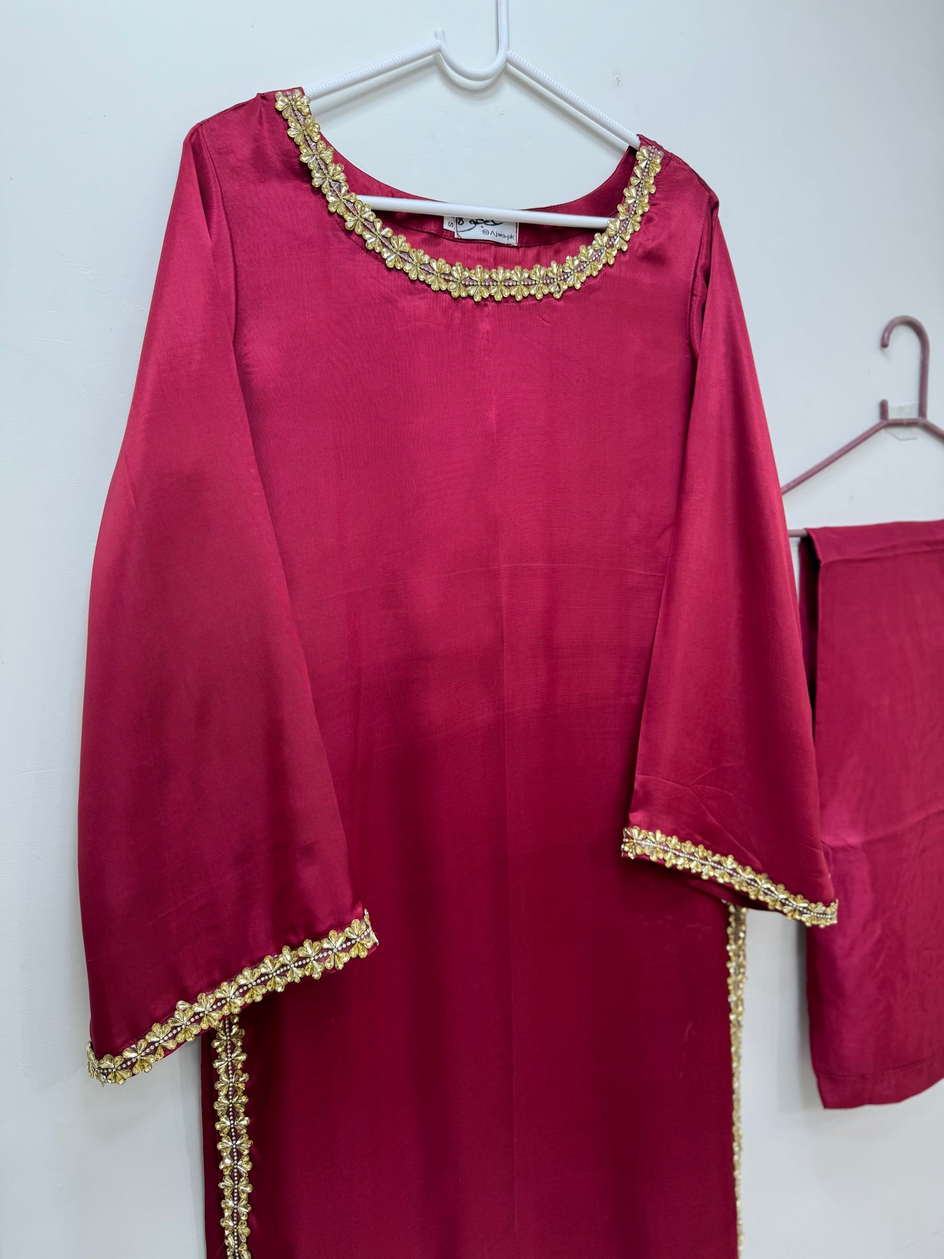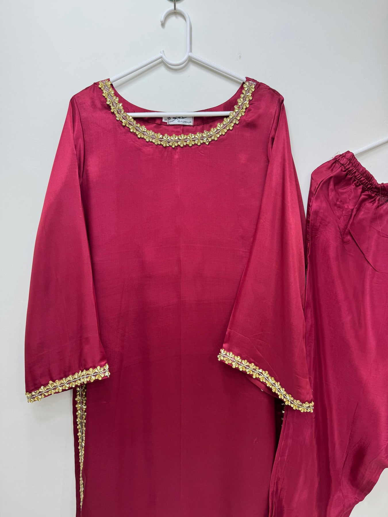 "3-piece dress set featuring a thai silk  fabric shirt and trousers, paired with a organza dupatta adorned with intricate embroidery work."
