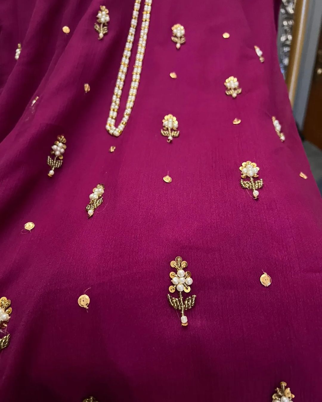 "Elevate your elegance with our 3-piece chiffon ensemble: a hand-embellished chiffon shirt, comfortable malai trousers, and a gracefully simple chiffon dupatta. Perfect for any occasion."